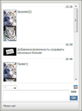 Мини-чат стал удобней и проще. Теперь он находится в левом нижнем углу экрана. Достаточно всего одного щелчка по кнопке "Мини-чат" для того, чтобы открыть его. Сообщения выглядят удивительно просто, а окно можно закрыть в любой момент.